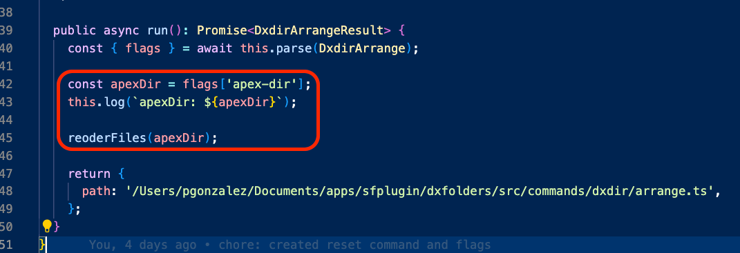 Here, reoderFiles is the original function I wrote in previous chapters; the difference is now we use the flag passed to the command. You can see we extract the value of the flag using the flags[apex-dir syntax.