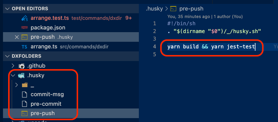 This basically means that when I run git push, the yarn build and yarn jest-test commands will run, which build the code (this is a typescript project) and run all tests; if everything passes, the code is pushed to the remote repo.