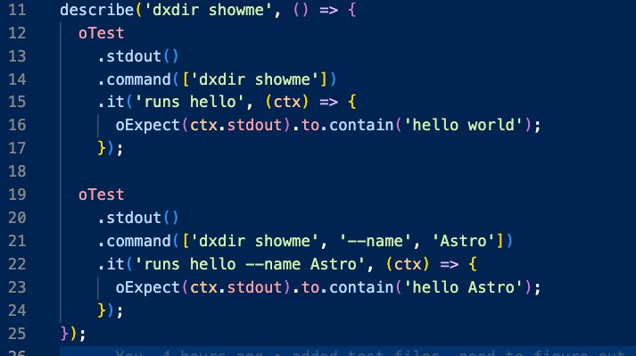 4- Finally, the sf CLI comes with built-in test and expect functions from Oclif (the project that supports the CLI) that you are meant to use to test if the output of your command is what you expect.